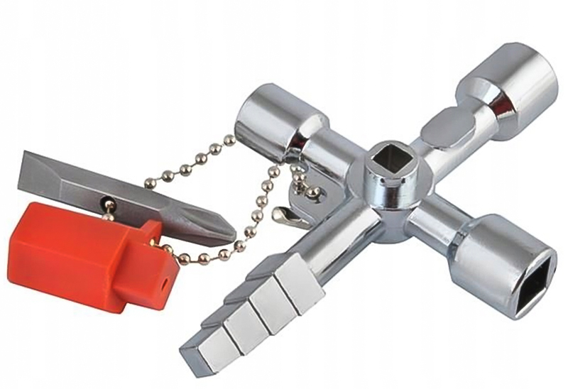 Atslēga ar uzgaļiem lielākās daļas vadības kārbu un skapju (apkures, elektrības, sanitāro) atvēršanai un aizvēršanai. Komplektā ietilpst ķēde ar adapteri un divpusējs uzgalis - plakans un krustenisks.