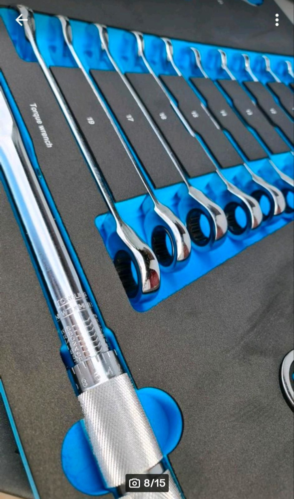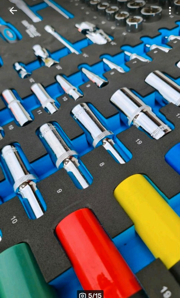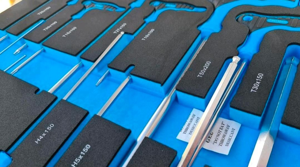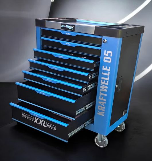Darbnīcas ratiņos esošie instrumenti ir izgatavoti no hroma vanādija tērauda un tiek glabāti putupolistirola/putuplasta ieliktņos.
