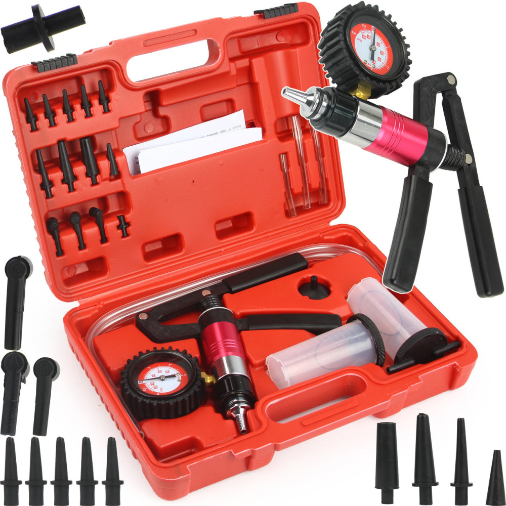Šī vakuuma sūknīša komplekts ir piemērots dažādu auto sistēmu, tostarp bremžu un dzinēja komponentu, atgaisošanai. Komplektā ir iekļauts metāla sūknis, plastmasas koferis un 21 daļa. Sūknis ir pielāgojams, lai mērītu vakuumu un spiedienu, kas padara to īpaši noderīgu plašai diagnostikai.