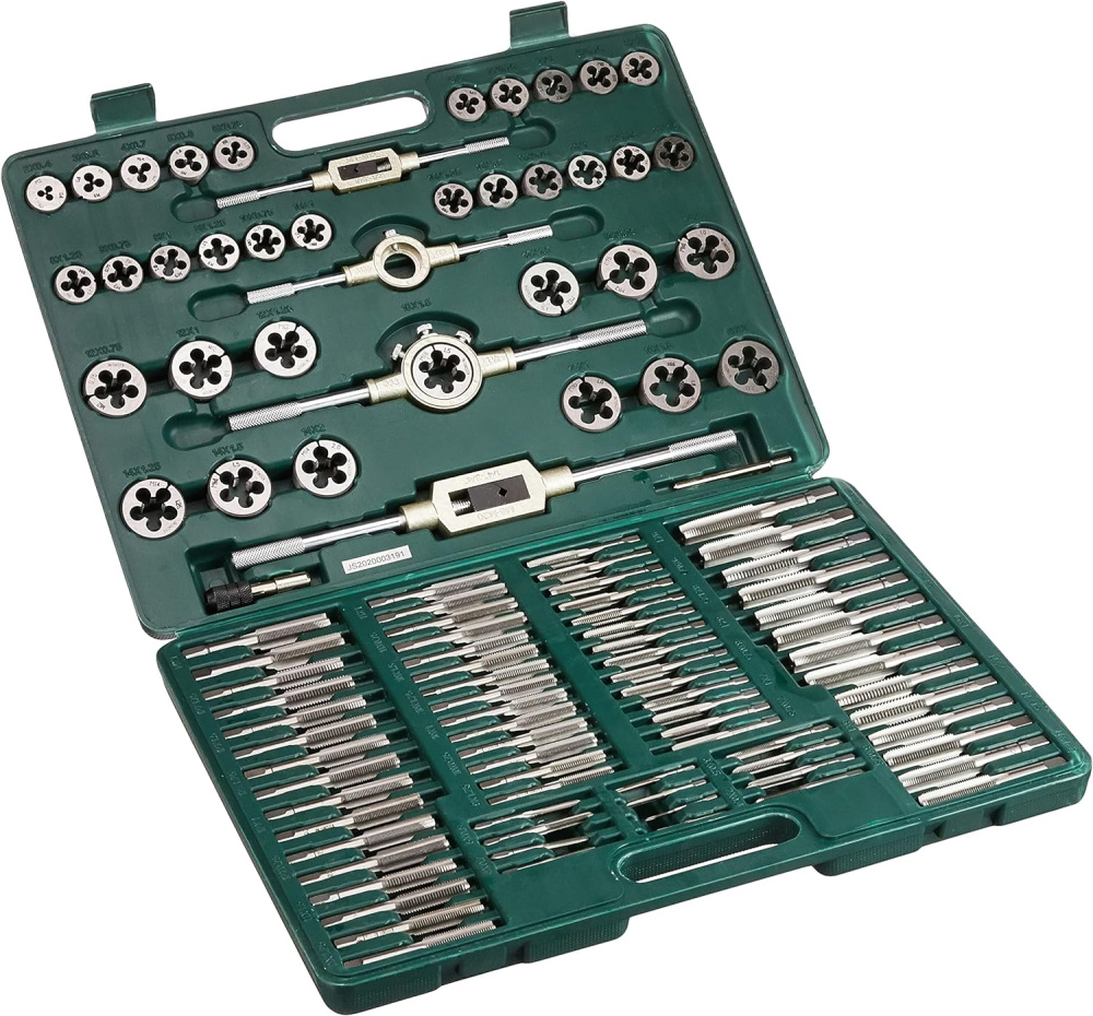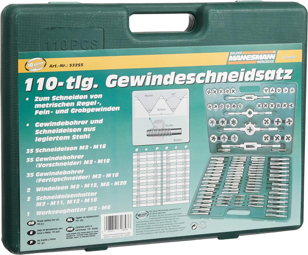 Brüder Mannesmann komplekts ar 110 detaļām ir piemērots iekšējo un ārējo vītņu iegriešanai.